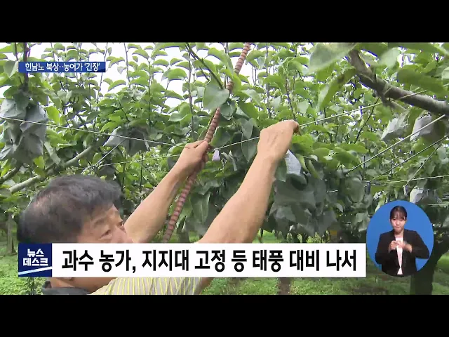 ◀ANC▶ 슈퍼 태풍 '힌남노'가 북상하면서 전남지역도 농작물과 시설물 피해가 우려됩니다. 배와 감 등 수확을 앞둔 농민들은 태풍 피해를 막기 위해 분주한 하루를 보냈습니다. 양정은 기자가 취재했습니다. ◀END▶ 영암군 신북면의 배 과수원입니다. 지지대로 나무 가지를 단단하게 고정했습니다. 태풍으로 상품성이 ...