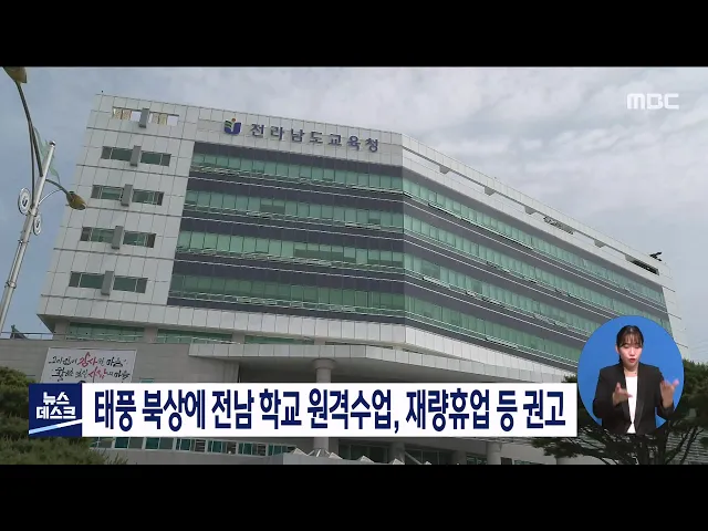 전라남도교육청은 11호 태풍이 북상함에 따라 모든 학교에 학교장 자율로 원격수업 전환이나 단축수업, 재량휴업 등을 할 것을 권고했습니다. 전남교육청은 24시간 비상근무 체제를 유지하면서 재난 상황에 신속히 대응하고 특히 전남이 태풍 영향을 받을 것으로 예상되는 5일과 6일 학생 안전에 차질이 발생하지 않도록 관...