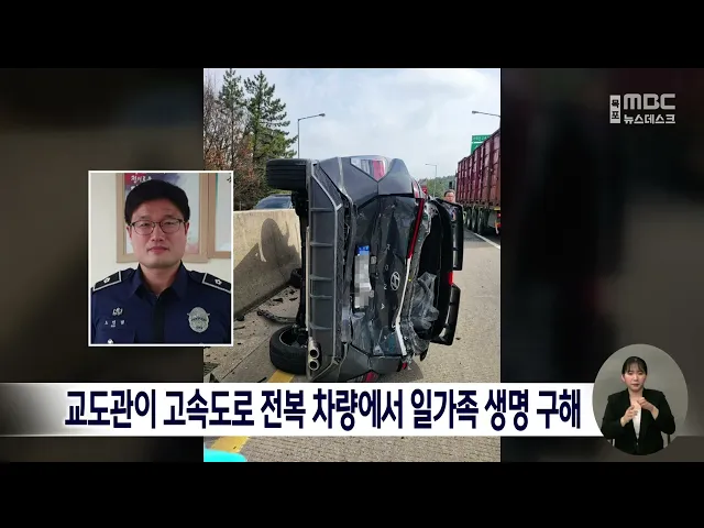 전복된 차량에 갇혀있던 일가족이 휴가 중이던 교도관에 의해 무사히 구조됐습니다. 지난달 29일 서해안고속도로 죽림IC 남악방향에서화물차와의 사고로 SUV가 전복됐는데,휴가중이던 목포교도소 소속 노인범 교위가전복된 SUV의 창문을 뜯고 손녀와조부모 등 3명을 구조했습니다.