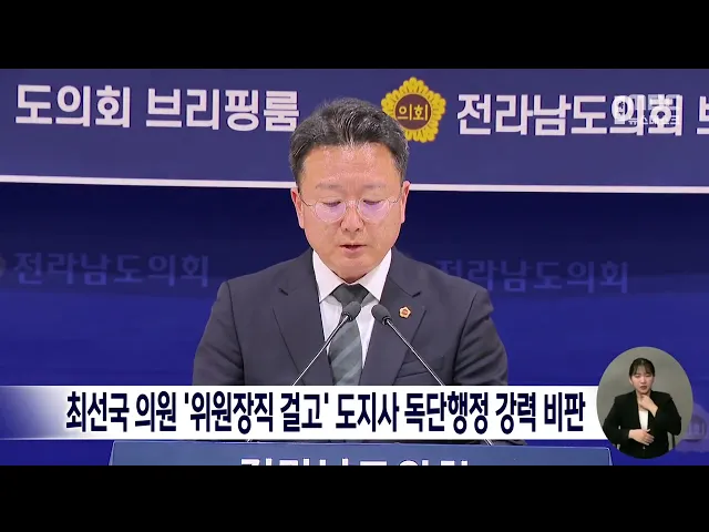 전남도의회 최선국 보건복지환경위원장이전남도 의대유치와 관련한 도지사의 독단행정을강력하게 비판했습니다.최선국 의원은도민의 숙원 사업인 의대 유치가 지사의 말 한마디에 손바닥 뒤집듯 뒤집혔고전라남도가 의회와 협치를 외면했다며 첫 단추부터 독단과 비밀로 잘못 채운 집행부를 신뢰할 수 없다고 강조했습니다....