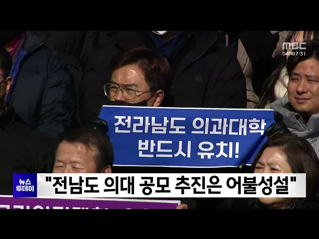 목포대 의과대학 유치 전남도민 추진위원회는어제 "전라남도의 의대 공모 추진은 어불성설"이라며 강력히 비난했습니다. 전남도민 추진위는 통합의대 추진이 어려워지자 외부기관에 전남의대 입지를 결정토록 하는 것은 의료공백 해소라는 도민의 뜻을 외면한 매우 신중하지 못한 처사라고 비판했습니다.