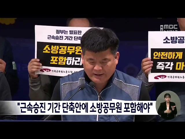 전국공무원노조 소방본부 전남지부가정부가 발표한 근속승진 기간 단축안에소방공무원을 포함시키라고 촉구했습니다. 소방노조는 오늘(3) 전라남도의회에서 열린 기자회견에서재난*안전 분야 공무원을 대상으로 한 근속승진 기간 단축안에 소방*경찰 공무원이 배제된 것은 특정직 공무원에 대한 명백한 무시라고 주장했습...