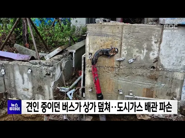 어젯밤(3) 10시 30분쯤목포시 옥암동의 한 편도 4차선 도로에서고장으로 견인되던 버스가견인차량과의 연결 부위가 끊어지며갓길의 인도로 올라가 상가 벽을 들이받았습니다.이 사고로 인명피해는 없었지만버스가 상가의 가스 배관을 충격하며인근 상가 2동의 가스 공급이 끊겼습니다.목포도시가스는 배관 관로의 잔여 가스...