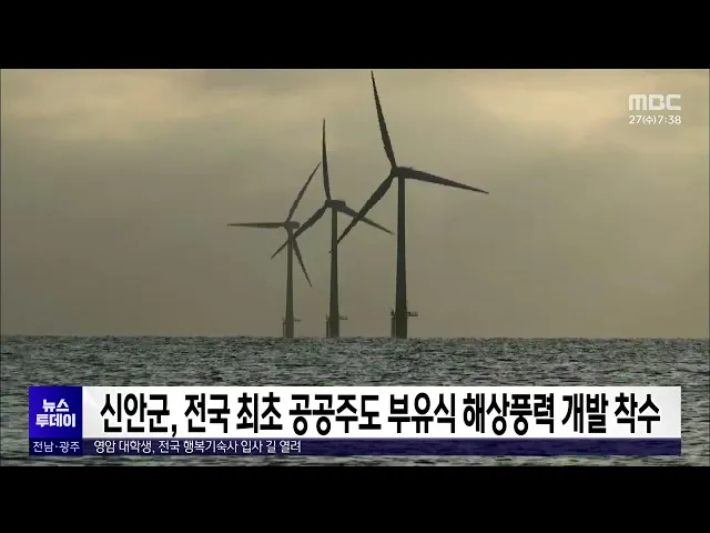 신안군이 국내 최초로 부유식 해상풍력 발전 개발에 착수합니다. 신안군은 어제(25일) 자은면 라마다프라자 호텔에서 주한 덴마크 대사 등이 참석한 가운데 공공주도 해상풍력 단지 개발 지원사업 착수 보고회를 갖고 사전 인허가 검토와 기본계획 수립,어업피해영향조사 등에 대한 과제가 제시됐습니다. 공공주도 해상풍...