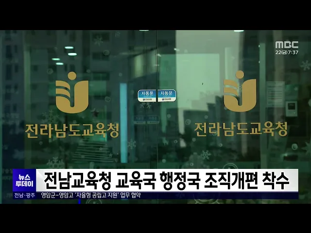 전남교육청은 교육국과 행정국 업무를 조정하고 분산 재배치하는 것을 내용으로 하는 조직개편에 착수했습니다. 도교육청은 조직개편의 기본 방향을 본청 조직의 슬림화와 관련 업무 통합, 일선 교육지원청 기능 강화 등으로 잡고 신속하게 추진하겠다고 밝혔습니다. 김대중 교육감은 “사회적인 변화와 필요에 의해 ...