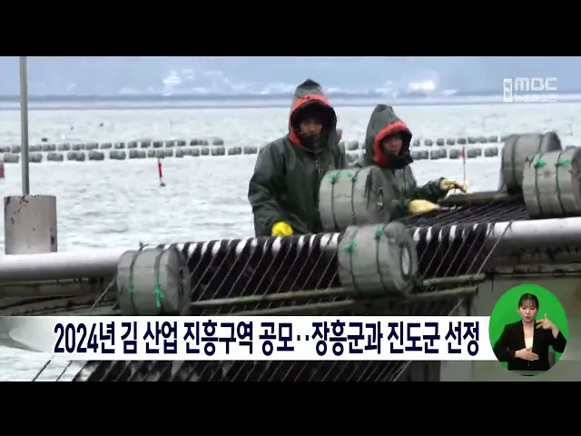 2024년 김 산업 진흥구역 지정 공모사업에 장흥군과 진도군이 선정돼 100억 원의 예산을확보하면서 김 산업 혁신클러스터 구축에 탄력을 받게 됐습니다.장흥군은 친환경 인증 확대와수출형 브랜드 개발 등으로 김 가공-유통-수출로 이어지는 고도화된 산업벨트를 구축한다는 전략입니다.진도군도 생산량을 확대하고 가공위...