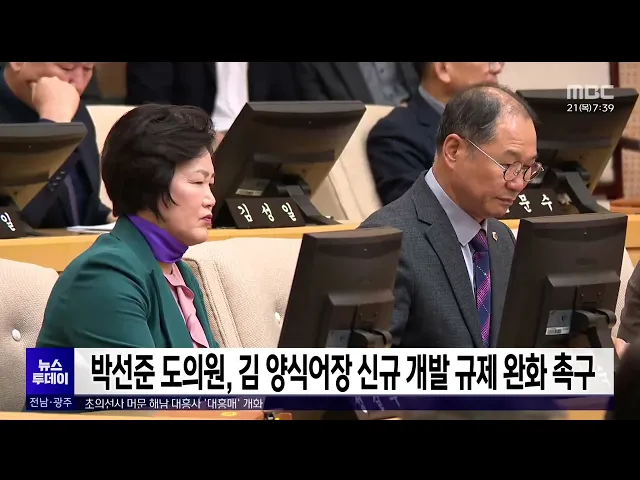 전남도의회 박선준 의원은한국의 대표 수출품목인 김의 생산량이 최근 정체되고 있는 점을 지적하며 정부의 김 양식어장 신규 개발 규제가반드시 완화돼야한다고 촉구했습니다. 박 의원은 "이같은 규제 완화는김 생산량 증대로 이어져 수급 불균형 해소와가격 안정화를 가져올 뿐 아니라어촌 경제 활성화와 김 산업 경쟁력...