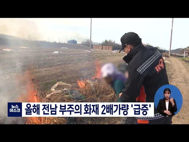 올해들어 전남에서 부주의로 인한 화재가 2배 가까이 급증한 것으로 나타났습니다. 소방청 국가화재정보시스템에 따르면 지난주까지 전남에서 발생한 화재 444건 가운데 70%가 부주의로 발생했으며 이는 지난해 같은기간보다 2배 가량 늘어난 수치입니다. 특히 쓰레기를 소각하거나 논두렁을 태우다 난 화재가 가장 많은 비...