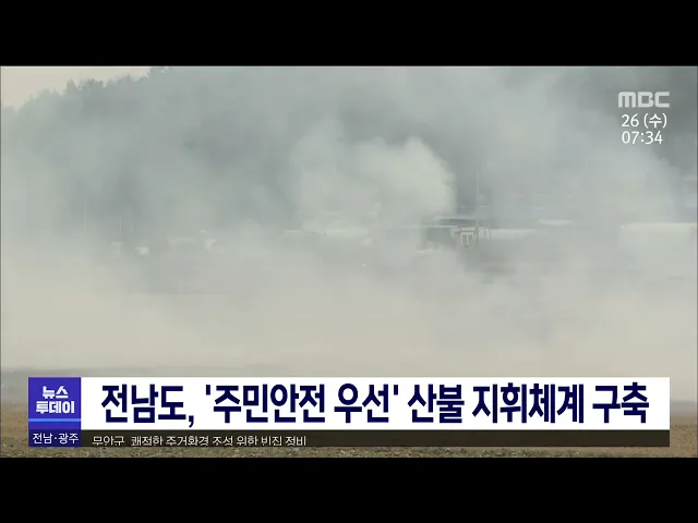 전라남도는 건조한 날씨에 논*밭두렁 소각으로 산불이 발생할 여건이 높아짐에 따라 시군 산불관계자 회의를 열어 산불 대비사항 점검과 소각행위 단속 등 생활 밀착형 산불 예방체계를 구축했습니다. 전남도는 22개 시군에 산불방지 대책본부를 가동하고, 헬기 8대와 산불방지인력 1천 400여명을 현장에 배치했습니다.