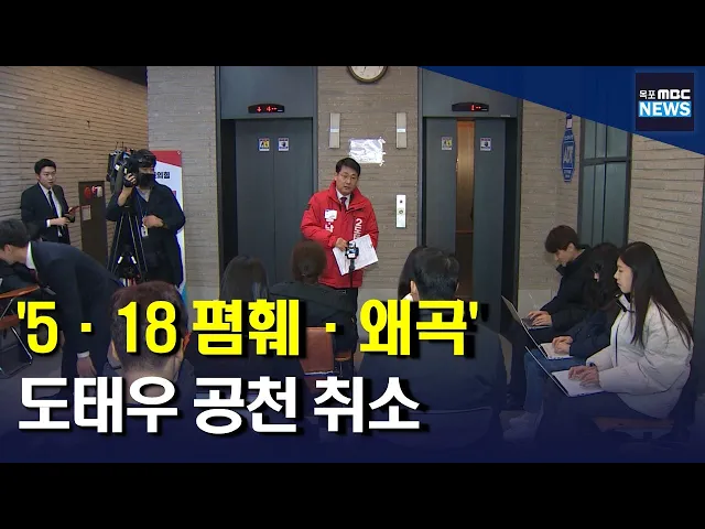 ◀ 앵 커 ▶국민의힘이 5.18 왜곡발언으로 말썽을 빚은 도태후 후보의 공천을 어젯밤 결국 취소했습니다.그런데 대통령실 황상무 시민사회 수석이출입기자와의 간담회에서 5.18 배후설을제기한 사실이 드러나 또 말썽입니다.주현정 기자가 보도합니다.◀ 리포트 ▶5.18을 폄훼하고 왜곡한 국민의힘 도태우 후보에 대해 국민의힘...