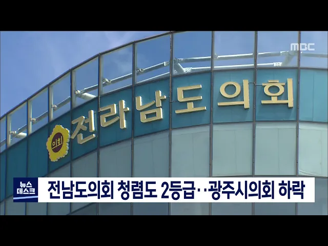 국민권익위원회에서 지방의회의 청렴도를 측정한 결과 전라남도의회가 2등급으로올해도 상위권을 유지했습니다. 반면 광주시의회는 4등급으로 지난해보다 한 단계 떨어졌으며올해 청렴도 측정 대상인나주시와 순천시의회는 각각 하위권인 4등급과 5등급을기록했습니다. 권익위원회는 올해 17개 광역의회는 모두 측정하고 ...