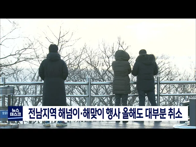 정부의 코로나19 방역조치 강화로전남지역 해넘이,해맞이 행사가 지난해에 이어 올해도 대부분 취소됐습니다.전남지역 15개 시군의 해넘이, 해맞이, 타종식 등 31개 행사 가운데 27개가 전면 취소됐으며목포 유달산 새해맞이 타종식과 순천만국가정원 해맞이 등 3개 행사는개최 여부를 현재 검토하고 있는 가운데 이 역시 ...