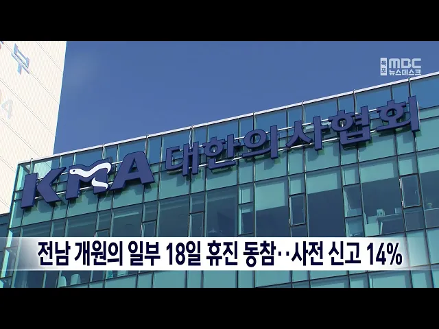 대한의사협회가 오는 18일 집단 휴진을 예고한 가운데 전남 지역 일부 개원의들도 동참 의사를 밝히고 있습니다.전라남도는 전남 지역의 행정명령 대상의원급 의료기관 966곳 가운데 137곳, 14%가 지난 13일 사전 휴진 신고를 했다고 밝혔습니다. 한편 전국의 의원급 의료기관 3만6천여 곳 가운데 휴진 신고를 한 곳은 천4...