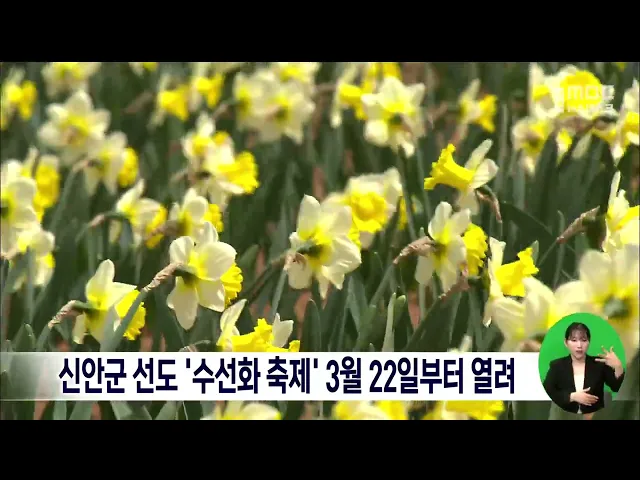 신안군 지도읍 선도리 일원에서 오는 22일부터 4월 7일까지 '2024 섬 수선화 축제'가 펼쳐집니다. 축제가 열리는 선도에는 13점 4헥타르의 면적에 아클, 핌퍼넬을 포함한 17종의 수선화 구근 2백 8만 구가 심어져 2백만 송이의 수선화가 화려하게 피어 장관을 이룹니다. 신안군은 축제 기간 동안 노란색을 옷을 입고 선도...