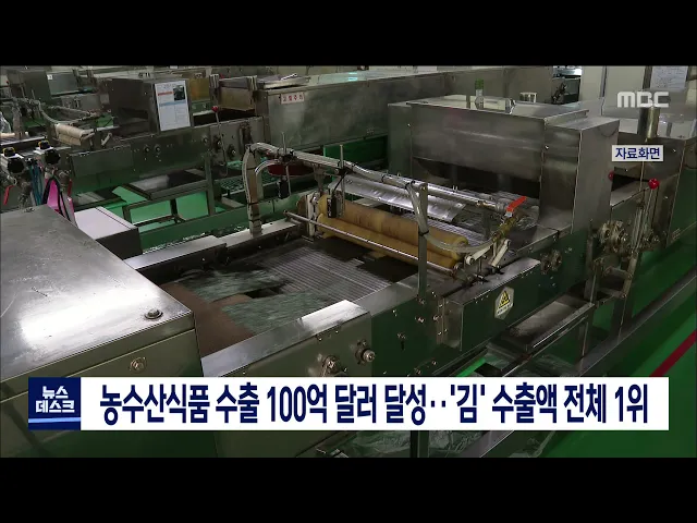 우리나라 농수산식품 수출액이통계작성 50년 만에 100억 달러 수출기록을 달성한 가운데단일품목으로 '김' 수출액이 1위를 차지했습니다. 해양수산부에 따르면김은 올해도 6억 달러 이상을 수출해 1위를 기록했으며 단일품목 기준 가장 많은 나라인 113개국에 수출하고 있습니다. '김'은 전국 생산량의 80%가량을전남에서 ...