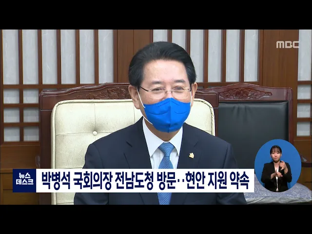 박병석 국회의장이 오늘전남도청을 방문해 지역 현안 사업에 적극적인 지원을 아끼지 않겠다고 말했습니다. 박 의장은 김영록 지사와 면담에서국립의과대학 설립과 여순사건 후속조치,국립남도음식진흥원 설립에 대해각별한 관심을 갖고 신경쓰겠다고 약속했습니다. 김영록 지사는 해상풍력 인허가 통합기구 설립과우주발...