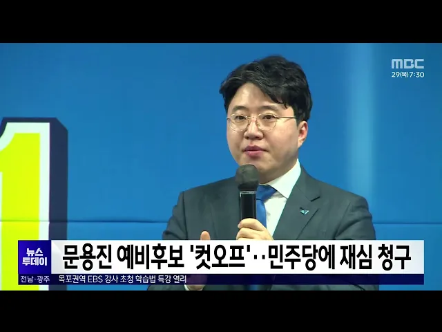 목포시 선거구에 나섰던문용진 예비후보가민주당 공천 심사 결과에 반발하며재심을 청구하겠다고 밝혔습니다. 문용진 예비후보는민주당이 목포시 선거구를김원이, 배종호 2인 경선으로 확정한 것은청년, 신인 경선 원칙을 위배한 것이라며재심청구와 함께 끝까지 최선을 다하겠다고 밝혔습니다.