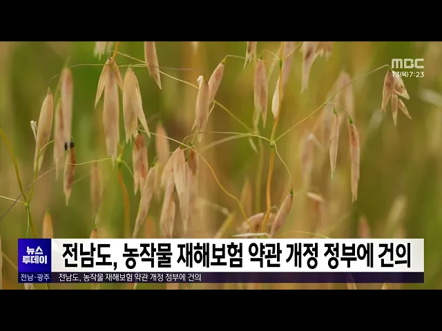 전라남도는 농작물 재해보험이 현실에 맞게 운영되도록 보험 약관 개정을 정부에 건의했습니다.전라남도는귀리의 재해보험 보상기준 수확량을 10a당 258㎏에서 416㎏로 상향할 것과시설 작물 보상금 지급 기준을 피해율 70% 이상에서 30% 이상으로 완화해 줄 것을 요청했습니다.또 일조량 감소와 관련한 보험금 지급 절차를...