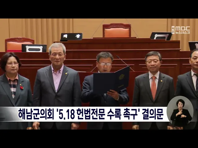 해남군의회는 오늘(12일) 5.18 민주화운동 정신의 헌법전문 수록을 촉구하는 결의문을 의원 전원 명의로 채택하고, 정부와 국회에 보냈습니다. 박상정 의원이 대표발의한 해남군의회 결의문에는 헌법개정을 통해 대한민국 민주주의와 인권 수호의 중요한 역할을 한 5.18 민주화운동 정신을 헌법 전문에 수록하고, 관련법을...