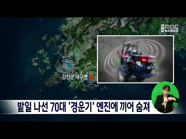 어제(11) 오후 5시 20분쯤강진군 대구면의 한 밭에서70대 남성이 경운기 엔진 부근에 옷이 끼어숨졌습니다.경찰은내리막길 운전 중 넘어진 경운기 바퀴를 빼내던 중 작동 중이던엔진 벨트에 옷가지 빨려 들어가면서사고가 난 것으로 보고정확한 사고 경위를 조사하고 있습니다.