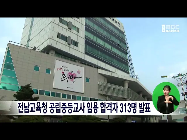 전남교육청은 오늘(8일) 2024학년도 공립 중등교사 임용시험 최종합격자 313명을 발표했습니다. 이번 합격자는 당초 예정은 336명이었지만, 장애인 응시자 미달과 결시 등으로 23명이 줄었습니다. 전체 합격자 313명 가운데 타 시·도 출신은 46%인 143명이고, 여성 합격자는 68%인 213명으로 지난해에 비해 감소했습니다.