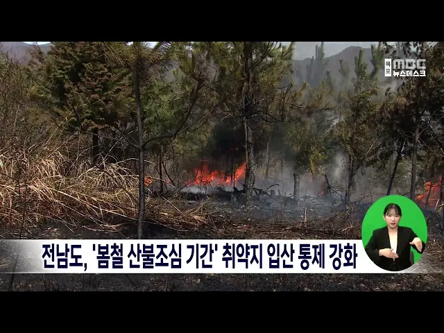 전라남도는 봄철 산불 조심 기간인 5월 15일까지 ‘입산통제구역과 등산로 폐쇄 구간’ 관리를 강화합니다.전라남도는산불발생 위험도가 지난해와 비슷할 것으로 예상하고, 취약지 중심으로 감시원을 집중 배치하는 한편, 봄철 산불 조심 기간에 전체 등산로 3천600km의 약 20%인 708km를폐쇄할 예정입니다.전남은 지난해 50...