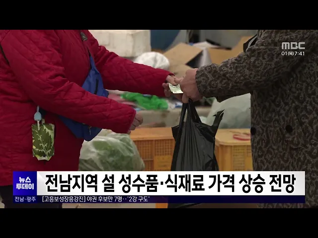 설을 앞두고 전남지역 주요 성수품과 식재료 가격들이각각 오를 것으로 보입니다.전라남도는 지난해 냉해와 장마 등 이상기후로 농산물이 17.1%, 과일류 소비자물가지수가 28.4%로 각각 상승하면서 설 성수품과식재료 가격이 오를 것으로 보고22개 시군에 종합상황실을 설치해 물가안정 관리에 나섰습니다. 또 설 성수품 16...
