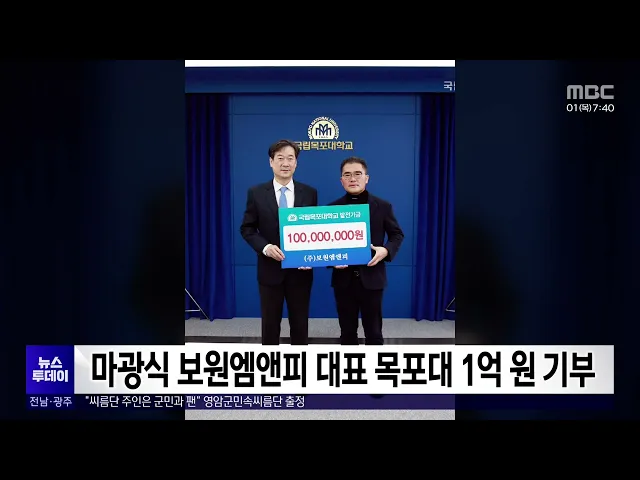 마광식 보원엠앤피 대표이사가 인재양성을 위해 사용해 달라며 목포대에 발전기금으로 1억원을 기부했습니다. 대불산단에서 조선업체를 운영하는 마광식 대표는 지난 2천5년 창립 이래 목포대 출신의 우수 인재들이 유입되면서 회사가 꾸준히 성장할 수 있었다며, 기회가 닿는 대로 꾸준히 기부활동을 이어가겠다고 밝혔습...