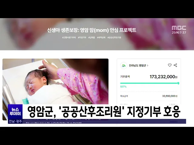 영암군이공공산후조리원 의료기기 마련고향사랑 지정기부로 1천 6백여 건,1억 7300만 원을 모금했다고 밝혔습니다. 지난 11월부터 지정기부로 모인 해당 고향사랑기부금은 오는 2027년 개원 예정인 공공산후조리원의심장충격기 등 의료기기 마련에 쓰일 예정입니다.