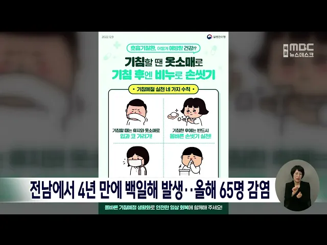 전남에서 4년 만에 백일해가 발생한 가운데올해 현재까지 백일해에 감염된 도민은65명으로 집계됐습니다. 연령별로는10대가 55명, 84%로 가장 많았고0~9세와 70세 이상에서 각각 3명씩발생했습니다. 백일해는 보르데텔라균에 의해 발생하는제2급 법정감염병으로 콧물과 기침 등가벼운 증상으로 시작해 심할 경우구토와 무...