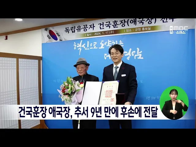 영암군은지난 2015년 추서된 건국훈장 애국장의후손을 9년 만에 찾아 정부를 대신해애국장과 훈장증을 전달했습니다. 건국훈장 애국장의 주인은고 박도집 선생으로 영암군 북이종면 등에서벌어진 박사회 의병장 전투에 참여해일본군과 치열하게 싸웠고 친일 동장 처단,헌병파견소 습격 등을 내걸고 전투하다체포돼 옥고를 ...