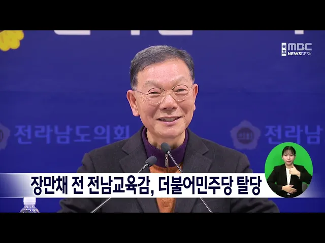 장만채 전 전남교육감이 더불어민주당 탈당을 선언했습니다.장 전 교육감은 전남도의회 기자실에서 기자회견을 열고 "어떤 패배에도 민주당을 당당하게 했던 민주와 정의의 가치들이 개인들의 권력욕과 이익에 함몰돼 버렸다"며 민주당을 탈당한다고밝혔습니다.한편 장 전 교육감은 이낙연 전 대표는 전남이 배출한 인적자...