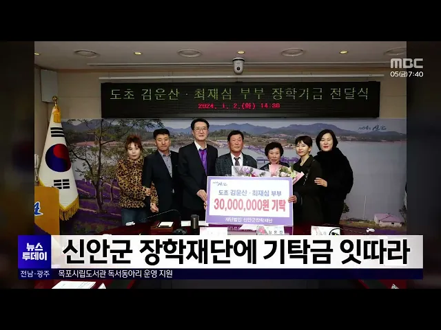 신안군 장학재단에 장학기금이 잇따라 전달돼 훈훈한 감동을 주고 있습니다. 염전을 일구는 신안군 도초면 김운산·최재심 부부가 사재를 털어 3천만 원의 장학금 전달했고대창식품 정현택 대표가 2천만 원,신안군 요트협회에서도 5백만 원의 장학기금을 기탁했습니다.