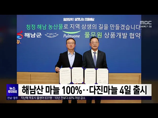 전라남도와 풀무원, 해남군이 업무협약을 맺고'땅끝 해남산 마을 100%'다진마늘 상품을 개발해 오늘부터 출시합니다.이번에 생산되는 다진 마늘은 남도종 마늘 고유의 향과 맛이 뛰어나다양한 요리에 양념 재료로 사용할 수 있습니다.전라남도는 마늘을 이용한 다양한 가공식품을개발해 안정적인 판로를 확보할 계획입니다.