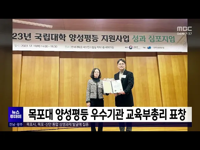 목포대는 성별 다양성을 높이는 정책을 적극 추진한 점을 인정받아 '양성평등 우수기관'으로 선정돼 교육부총리 표창을 수상했다고 밝혔습니다. 전국 39개 국립대와 국립대 법인을 대상으로 실시한 평가에서 목포대는 기획처와 입학처부처자 등 핵심 보직 등에서 여성교수를 대거 발탁하고, 신임 교수 채용에서도 여성교...