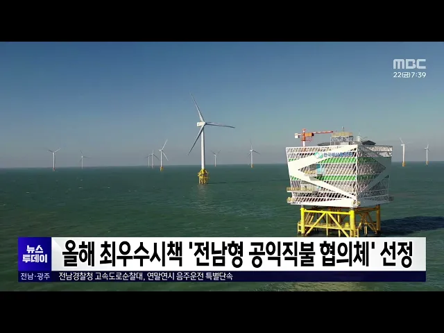 전라남도는올해 도정을 빛낸 10대 시책을 선정했습니다.최우수시책에는 전남형 공익직불 협의체 전국 확대가 선정됐고우수시책에는 전남 해상풍력 규제 전봇대 세 개나 싹뚝과 전국 최초 청년 맞춤 전남형 만 원주택 사업,전국체전 개최 등이 선정됐습니다.