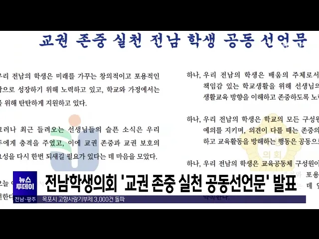 전남학생의회는 하반기 정기회를 갖고 '교권 존중 실천 학생 공동 선언문'을발표했습니다. 학생들은 선언문을 통해 교사의 교육활동과 생활교육 방향을 이해하고 존중하도록 노력하자고 강조했습니다. 전남학생의회는 이번 정기회에서'전남교육청 교육인권 조례 제정' 등정책 12건의 안건을 발의했습니다.