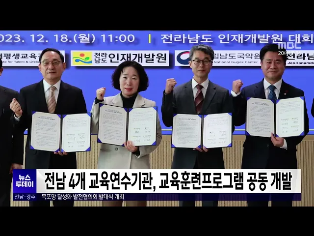 전남인재개발원과 국립남도국악원,전남인재평생교육진흥원, 전라남도교통연수원등4개 교육연수기관이 업무협약을 체결했습니다.이들 기관들은우수 강사 상호 지원과 함께교육자원, 콘텐츠를 공유하기로 했으며2024년 교육훈련프로그램을 공동 개발하고 강의를 개설하는 등 다양한 분야에서앞으로 적극 상생 협력하기로 했습...