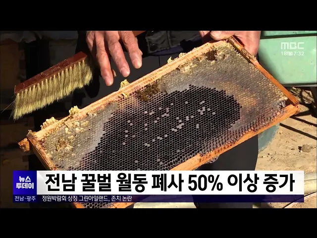 병해충과 이상기후 등으로 월동 꿀벌 폐사가증가하면서 전라남도가 대책마련에 나섰습니다.전라남도에 따르면도내 월동 꿀벌 폐사는 지난해 1,280농가에서올해 2042개 농가로 59% 증가했습니다.전라남도는 월동 꿀벌 피해를 줄이기 위해스마트 벌통 보급 등 월동 성공률 향상을 위한 다양한 지원에 나서기로 했습니다.