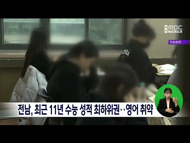 최근 11년간 수능 성적을 분석한 결과 전남지역 학생들은 영어과목이 특히 취약한 것으로 나타났습니다. 최근 발표된 교육부의 전년도 수능시험 분석결과에 따르면 전남의 국어 표준점수 평균은 93.3, 수학 93.4로 전국 17개 시도 가운데 15위를 차지했습니다. 또 절대평가인 영어의 경우 90점 이상인 1등급 비율이 3.2%로,...