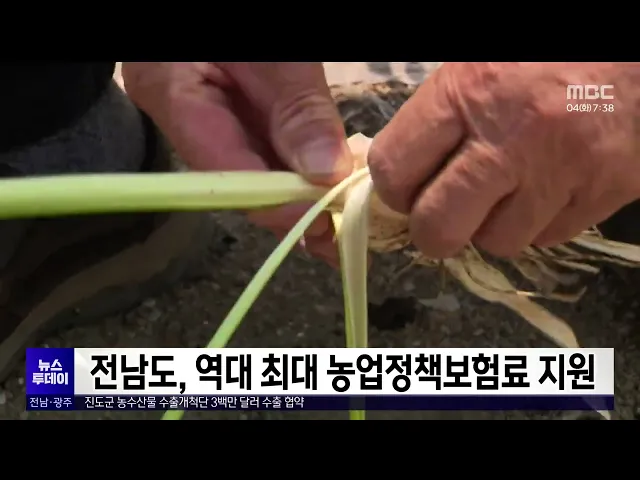전라남도는자연재해가 일상화,대형화 됨에 따라농업인의 생명과 재산을 보호하기 위해농업정책 보험료 지원사업비로 역대 최대인1946억원을 투입하기로 했습니다.농작물재해보험 지원 대상은벼 등 73개 품목, 14만 9천ha입니다.지난해 전라남도는집중호우와 저온 등 7번의 재해와 농작업 중사고 등으로 1773억원의 보험금을...