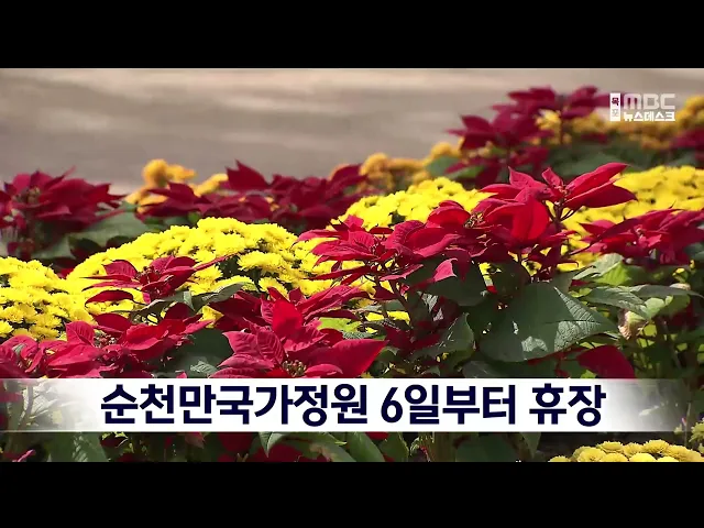 순천만국가정원이 내일(6일)부터 휴장에 들어갑니다. 순천시는 순천만국가정원에 대해 각종 시설물 철거 재정비와 내년 화려한 봄꽃 연출 등을 위해 6일부터 휴장에 들어간다고 밝혔습니다. 시는 또한, 내년 봄 다시 개장하는 시점까지 국가정원을 거점으로 한 생태, 문화도시로 도약을 위해 준비하고 있는 연관 사업들...