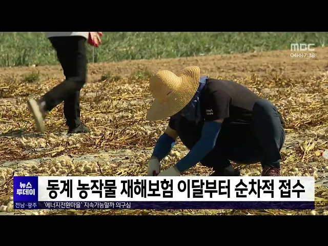 전라남도는 이달부터 마늘과 시금치 등 동계작물 8개 품목에 대해 농작물 재해보험을 가입해 줄 것을 당부하고 있습니다. 해당 품목는 마늘과 차, 시금치, 보귀, 밀, 양파 등으로 오는 4일부터 다음 달 24일까지며가입 농가에게 보험료의 90%가 지원됩니다.