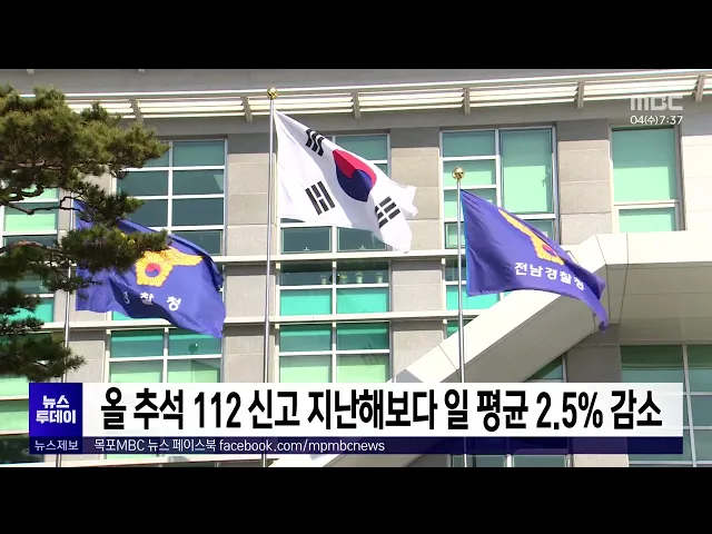전남경찰청은 올해 추석 연휴기간 112 신고가지난해보다 일 평균 2.5% 감소했다고밝혔습니다. 경찰은 범죄 취약장소에 대한 사전점검과교통안전 확보 등에 주력했으며, 야간 상시 음주단속과 교통사고 다발지역 집중 순찰활동 등을 통해 교통사고도 지난해보다 일평균 31.7% 감소했다고 설명했습니다.