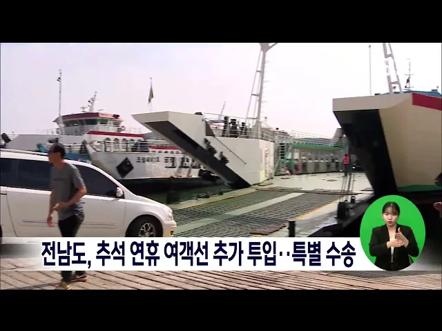 전남도는 추석 연휴 섬 귀성객과주민들을 위한 특별 수송 대책을 추진합니다. 전남도는 10월 3일까지52개 항로 가운데 14개 항로에여객선 2척을 추가로 추입하고 기존 여객선 운항 횟수를 확대할 계획입니다. 올해 추석 연휴 기간 연안여객선 이용객은 19만7천여 명으로 지난해보다 2~3퍼센트 증가할 것으로 전망되고 있습...