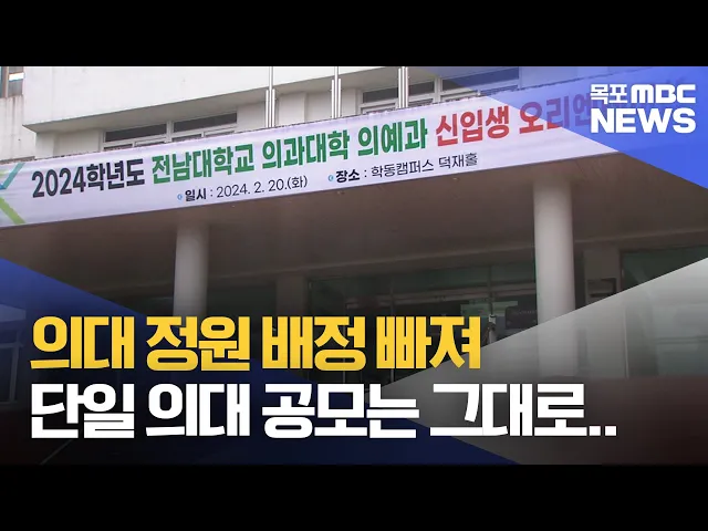 ◀ 앵 커 ▶교육부와 한국대학교육협의회가의대 정원 증원을 포함한 내년도 대입전형 시행계획을 확정해 발표했습니다.그런데 전남도가 건의했던 2026학년도 전남 의대 정원 배정은 포함되지 않았습니다. 전라남도는 아쉽지만 당초 계획대로공모를 진행하고 올해 안에 의대 정원 배정을다시 요청하기로 했습니다.김양훈 기자...
