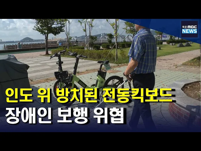 ◀ANC▶ 인도 곳곳에 아무렇게나 방치된 전동킥보드와 공유자전거를 쉽게 볼 수 있는데요. 인도를 가로막거나 쓰러져 있는 경우가 많아 특히 장애인의 보행을 위협하고 있습니다. 안준호 기자가 취재했습니다. ◀END▶ ◀VCR▶ 목포평화광장 인근 인도입니다. 인도 한가운데는 물론 인도 곳곳에 전동킥보드와 공유자전거...