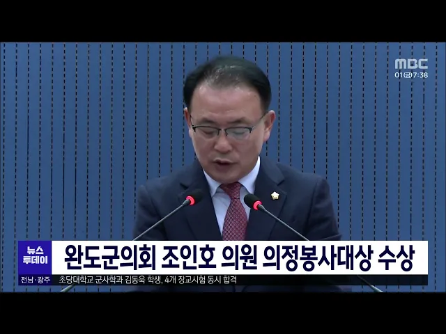 완도군의회 조인호 의원이 대한민국시군자치구의회의장협의회에서 '대한민국 지방의정 봉사 대상'을 수상했습니다. 조인호 의원은 여객선 야간운항 지원 조례 등 도서지역 생활 환경 개선정책에서 높은 평가를 받았으며 아동·여성·청소년 관련 조례 제정을 과정에서 지역민의 안전과 재산을 보호하는 의정활동을 펼쳐왔습...