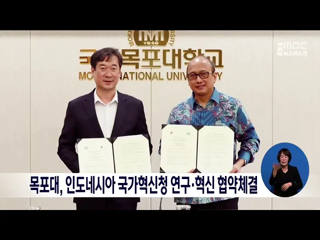 목포대는 오늘(31) 인도네시아 국가연구혁신청과 협약을 체결하고 에너지와 전기, 정보, 공학분야 등 다양한 분야에서 공동연구를 추진하기로 했습니다. 이번 협약은 지난 3월 송하철 목포대 총장이 인도네시아 국가연구혁신청을 방문해 메가와티 전 대통령을 예방한 자리에서 협의된 것을 실현한 것입니다.
