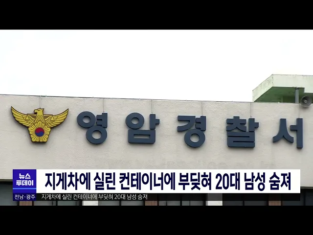 어제(30) 오전 8시 30분쯤 영암군 삼호읍의 한 물류회사 컨테이너 하차장에서 이 회사 20대 직원이 지게차에 실린 컨테이너에 부딪혀 병원으로 옮겨졌지만 숨졌습니다. 경찰은 지게차 운전사가 이 남성을 발견하지 못해 사고 난 것으로 보고, 정확한 사고 경위를 조사하고 있습니다.